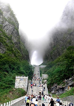 選擇乘索道游覽天門山是最佳視角。索道吊廂一出站房,馬上就騰空飛了起來,從城市的一棟棟樓頂掠過,猶如在城市上空滑翔。翻過一道山梁之后,城市被遠(yuǎn)遠(yuǎn)拋在了視線以外,大片翠綠的稻田映入眼簾,透過打開的通風(fēng)窗口,一陣陣青草水田特有的清香沁入心脾;蚋呋虻偷霓r(nóng)舍不時從我們身下滑過,牛羊們?nèi)齼蓛捎崎e的在田間浮動著,靜謐、安詳。再翻過一座山峰,我們便立即被滿山的青翠所包圍,萬仞絕壁也已投懷送抱。索道支架矗立于絕壁天險中,或挺立或傾倒或探頭或擁抱,我們繼續(xù)在艱險中游歷,時而隱沒于云堆,時而出世于蒼穹。這時你除了那滿懷的驚險刺激外有的便只有望索而興嘆了。我拍了很多片子,但是總覺得還是沒有足以記錄下來這座空中盆景的壯麗。