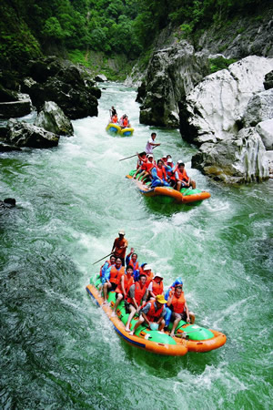 猛洞河水量豐富,河流坡降大,水急灘多浪奇,高大的峭壁直插水面,兩岸并相靠攏,形成幽深的峽谷景觀。沿河兩岸古木蒼天,蒼翠欲滴,奇石錯(cuò)落,流泉飛瀑隨處可見(jiàn),下游一路水碧山青,風(fēng)光秀麗,野猴成群,溶洞奇特。猛洞河天下第一漂項(xiàng)目位于猛洞河支流,全長(zhǎng)47公里,最精彩處位于哈妮宮至牛路河段,長(zhǎng)約17公里。該景區(qū)兩岸多為原始次森林,蔥蔥郁郁,水流湍急,碧綠清亮,有十里絕壁,十里瀑泉,十里畫(huà)卷,十里洞天的美譽(yù)。其中有急流險(xiǎn)灘108處,大小瀑布20處。漂流,穿急流,越險(xiǎn)灘,闖狹谷,捕激浪,有驚無(wú)險(xiǎn),回味無(wú)窮。特別是哈妮宮、三角巖、雞籠門(mén)、遇仙峽(捏土)、閻王灘、落水坑、夢(mèng)思峽、鯉魚(yú)剖肚、三大炮等景點(diǎn),無(wú)不令人叫絕觀止。
