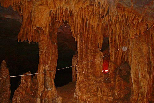 | 藏君洞為一大型天然溶洞,溶洞長25000米,已探明洞長4000m,洞內(nèi)洞中有洞、洞中有河,迂回曲折,地下河流水潺潺,溶洞分布在石炭系中、上統(tǒng)碳酸鹽巖中,洞內(nèi)鐘乳石十分豐富:石筍、石柱、石幔、石樓、石像比比皆是。洞內(nèi)構(gòu)造奇特,石鐘乳千姿百態(tài)、絢麗多彩,景觀奇秀,珍品奇絕,是我國少有的大型碳酸鹽巖巖溶洞穴之一。目前已開發(fā)的4000m洞穴中,由十二個(gè)大的溶洞群構(gòu)成,由洞口往里有護(hù)君堂、惠帝殿、兩重天、南巡廳、不夜城、龍鳳宮、北國廳、江南廳、江河壩、閱兵場、國寶廳等溶洞景觀區(qū)。溶洞一般高5~30m,長60~100m,寬10~20m,面積60~200㎡。十二個(gè)溶洞沿地下河呈串球狀分布,洞與洞之間有巷道(地下河管道)相連,溶洞中景觀十分豐富,仿佛是一個(gè)瑰麗的地下宮殿。如護(hù)君堂內(nèi)有“尚書帽”、“御馬”、“貓頭鷹”、“小羊羔”、“老夫妻”、“天宮浴盆”等景點(diǎn),惠帝殿內(nèi)由“斷劍石”、“龍椅”、“觀音立佛”、“觀音蓮花寶座”等,“蔬果長廊”中有形似花菜、白菜、絲瓜、茄子、黃瓜等石筍,不夜城內(nèi)有乳白色石鐘乳巖溶坡面,龍鳳宮內(nèi)有石幔、石柱琳瑯滿目及鐘乳石構(gòu)成的似漢白玉“龍鳳石床”、“旭日東升”的浮雕石鐘乳墻、“燈籠群”、“攀龍柱”、“石蓮花”等,國寶廳巨型石柱等,巷道側(cè)壁唐僧師徒“西天取經(jīng)”壁畫等,景觀類型齊全,是巖溶洞穴中具有典型地學(xué)意義的巖溶地貌景觀,屬國家級(jí)的地質(zhì)遺跡景觀。