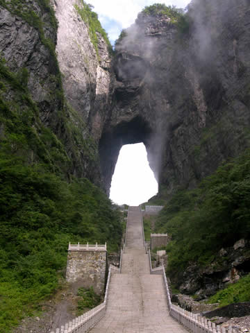 天門洞圖片 天門洞南北對(duì)開于千尋素壁之上,扶搖而通天,氣象變化萬(wàn)千,似明鏡似天門鑲嵌于蔚蔚天幕之上,終年吞白云吐紫霧,渲染著神秘莫測(cè)的氣氛而更顯出塵脫俗,正所謂奪盡天地之造化,藏盡天地之玄機(jī),而成為千古難解之謎,尋尋覓覓,終是難解。置身其間,宛如入身天宮帝閣一般,大有“我欲乘云仙飛去,直入九霄攬乾坤”之感!疤扉T洞開云氣通,江東峨眉皆下風(fēng)”元朝的著名詩(shī)人張兌曾這樣贊嘆,磅礴的氣勢(shì)由此可見。