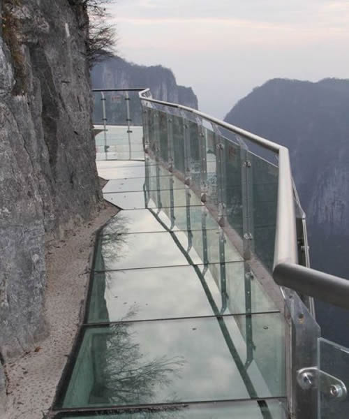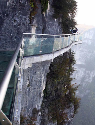 | 2011年10月1日,張家界天門山國家森林公園新建的玻璃棧道正式對游客開放。玻璃棧道懸于天門山頂西線,長60米,最高處海拔1430米。是張家界天門山景區(qū)繼懸于峭壁之上的鬼谷棧道、憑空伸出的玻璃眺望臺、從玻璃臺可以看見下面。玻璃臺伸出棧道有4-5米,專供游人拍照、橫跨峽谷的木質吊橋后打造的又一試膽力作。為了讓游客零瑕疵的透過玻璃橋看到美麗的風景,上橋的游客均要求戴上鞋套,以保持玻璃橋的透明和干凈。玻璃棧道的刺激震撼,可與舉世聞名的美國大峽谷玻璃走廊“天空之路”媲美,因而有了東方“天空之路”的美譽。