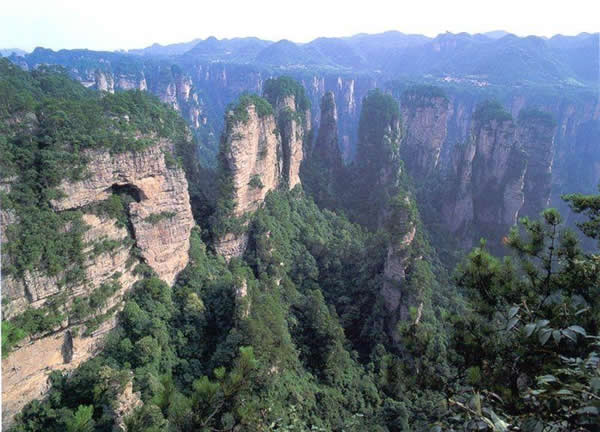 大觀(guān)臺(tái) 這就是大觀(guān)臺(tái)。極日遠(yuǎn)眺,千百座奇峰盡收眼底。一位詩(shī)人說(shuō),武陵源的砂巖石峰是一步一觀(guān)景,千步千造型,一山有四季,十步不同大。專(zhuān)家測(cè)算出武陵源石峰有3103座。一如一位高超的雕塑大師,模擬宇宙萬(wàn)物,無(wú)不形態(tài)逼真,維妙維肖,栩栩如生,呼之欲動(dòng)。有的如海螺出水,有的如金龜銜日,有的如蓮花盛開(kāi),有的如天橋橫空,有的如長(zhǎng)槍刺大,有的如寶塔聳立,有的如老人采藥,有的如玉女梳妝,有的如將軍出征,有的如戰(zhàn)馬長(zhǎng)嘯,有的如情人幽會(huì),有的如夫妻相擁,有的如仙女散花,有的如村姑守望……有的孤峰獨(dú)秀,有的直插云霄,有的婷婷玉立,有的威武勇猛,有的小巧玲瓏,有的大氣磅礴。進(jìn)入武陵源,但見(jiàn)一片峰的森林,峰的世界,峰的海洋。挺拔、奇秀、集中、原始、粗獷、古野。這就是武陵源。 一位藝術(shù)大師說(shuō):武陵源的山峰,改寫(xiě)了山的概念。大攝影家陳勃說(shuō) :“三山五岳堪比美,華夏風(fēng)光第一流!蓖趵^杰先生說(shuō):“武陵源上二日游,勝讀千篇李杜詩(shī)!痹S世杰先生說(shuō):“秀幽險(xiǎn)峻稱(chēng)奇絕,五岳黃山拜·卜風(fēng)。”李成瑞先生為此大抱不平:“神州勝景誰(shuí)為最?須請(qǐng)霞公重評(píng)勘!笨上煜伎蜔o(wú)緣到大觀(guān)臺(tái)來(lái),也不可能為武陵源作甚評(píng)價(jià)了。