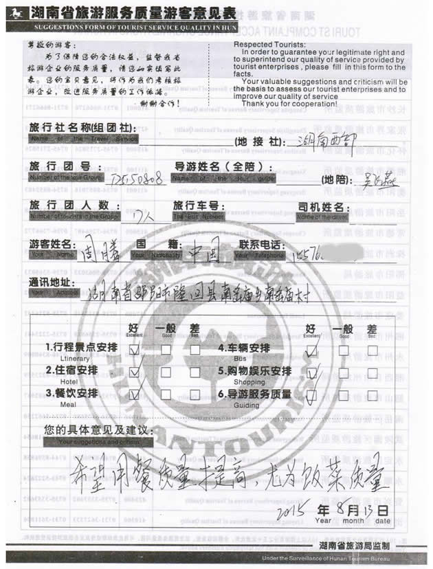 8月初,湖南邵陽(yáng)周先生一行17位貴賓與湖南西部(張家界)中國(guó)國(guó)際旅行社工作人員——小王取得聯(lián)系,經(jīng)過(guò)商談,雙方達(dá)成協(xié)議并簽訂旅游合同,于8月9日抵達(dá)張家界,開(kāi)始張家界之旅。此次行程是由我社優(yōu)秀導(dǎo)游——吳飛燕負(fù)責(zé)旅游接待工作,吳導(dǎo)在旅游過(guò)程中講解詳細(xì),客人也很滿意,在意見(jiàn)表上要求我們:希望用餐質(zhì)量提商,尤為飯菜質(zhì)量,我們感謝周先生為我社提出了寶貴意見(jiàn),謝謝周先生。同時(shí)也感謝周先生選擇湖南西部(張家界)中國(guó)國(guó)際旅行社,以及您對(duì)湖南西部國(guó)旅的信任與支持。我們會(huì)繼續(xù)努力,做好旅游接待工作。期待下一次與您的合作,祝您愉快!