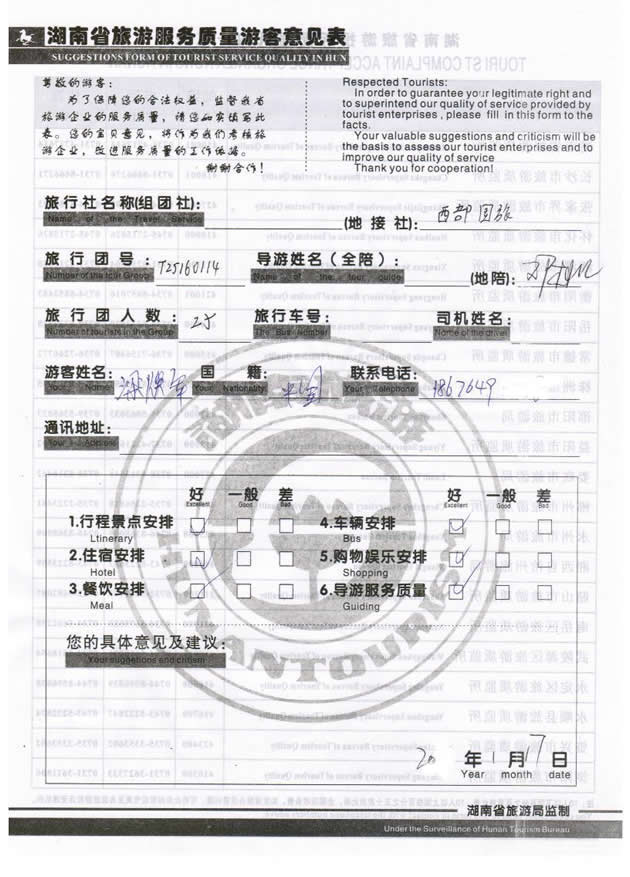 【旅游接待回顧】 1月份,廣東梁女士一行25位貴賓與湖南西部(張家界)中國國際旅行社工作人員——張群取得聯(lián)系,經(jīng)過商談,雙方達成協(xié)議并簽訂旅游合同,于1月14日抵達張家界,開始張家界之旅。此次行程是由我社優(yōu)秀導游——鄧桃紅負責旅游接待工作,鄧導在旅游過程中講解詳細,客人也很滿意。同時也感謝梁女士一行貴賓選擇湖南西部(張家界)中國國際旅行社,以及您對湖南西部國旅的信任與支持。我們會繼續(xù)努力,做好旅游接待工作。期待下一次與您的合作,祝您愉快!