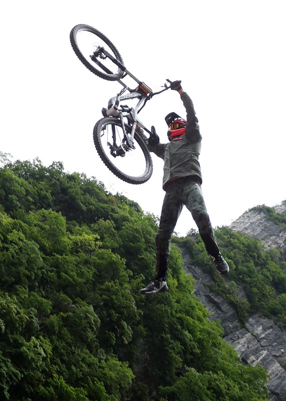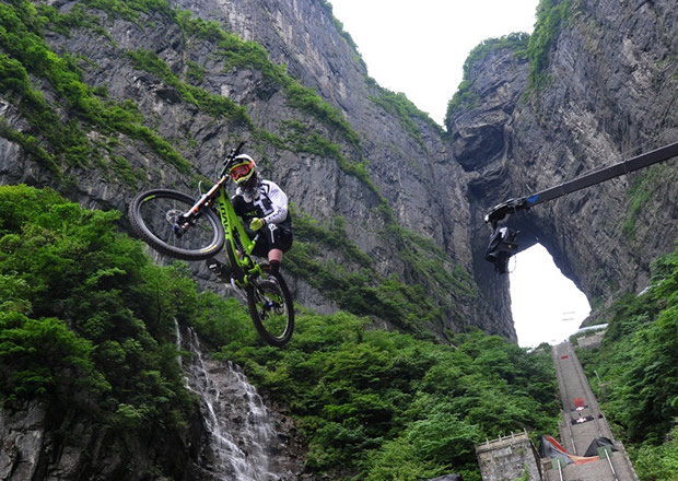 張家界天門山天門洞,999級(jí)臺(tái)階,以39°斜坡筆直往下,看一眼都覺(jué)得眩暈。如果有人騎著山地車一路沖下來(lái),你一定會(huì)說(shuō)“瘋了!”。
