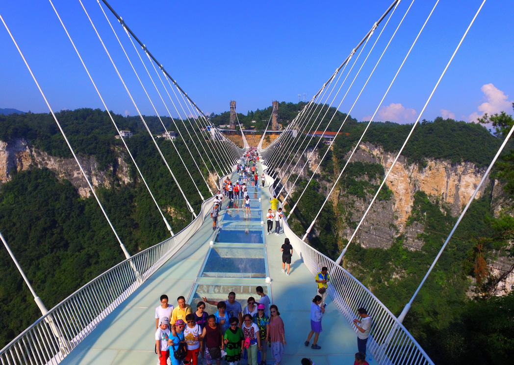 張家界大峽谷玻璃橋位于湖南省的張家界大峽谷景區(qū)栗樹埡和吳王坡區(qū)域內(nèi),為一座景觀橋梁,兼具景區(qū)行人通行、游覽、蹦極、溜索、T臺(tái)等功能。主跨430米,一跨過峽谷,橋面長375米,寬6米,橋面距谷底相對(duì)高度約300米。這座全透明玻璃橋長度、高度位居世界第一。
