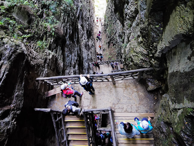 天梯棧道的木板很窄,依次往下延伸,就像一架天梯,把我們送往迷人的仙境。這道“天梯”不是天賜的,而是靠了當(dāng)?shù)氐纳矫瘢道K索,手扶峭壁,肩扛背馱,將這些堅硬而沉重的石頭從山頂一塊一塊地運(yùn)來、鋪好,鋪成現(xiàn)在這條看似險峻、其實(shí)結(jié)實(shí)安全的1600多級石階棧道。