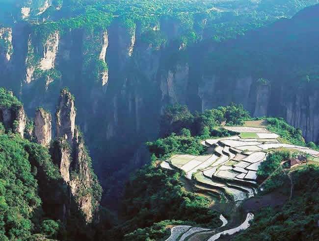 空中田園坐落在天子山莊右側(cè)經(jīng)老虎口、情人路方向兩公里處的土家寨旁,海拔1000余米。它的下面是萬丈深淵的幽空中田園谷,幽谷上有高達(dá)數(shù)百米的懸崖峭壁,峭壁上端是一塊有3公頃大的斜坡梯形良田。田園三方峰巒疊翠,林木參天,白云繚繞,活像一幅氣勢(shì)磅礴的山水畫。登上“空中田園”。清風(fēng)拂袖,云霧裹身,如臨仙境,使人有青峰鳴翠鳥,高山響流泉,身在田園里,如上彩云間”之感 。