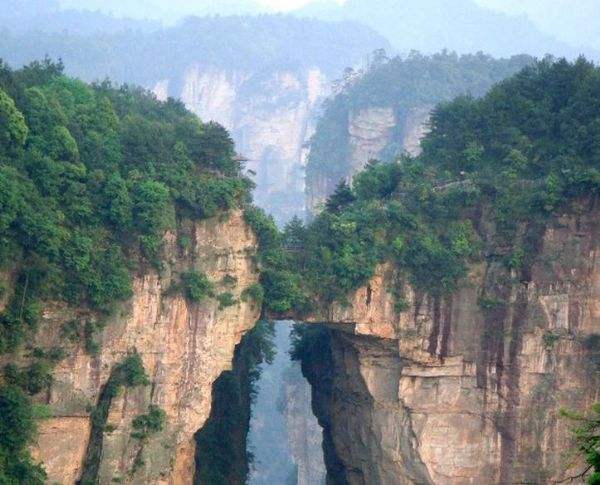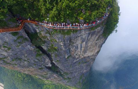 站在棧道上俯瞰群山,古人“會(huì)當(dāng)凌絕頂,一覽眾山小”的感覺油然而生。由于天門山是國家森林公園,植被特別豐富,加上典型的喀斯特地貌,所以,在這條棧道上更能找到一種在乘坐直升飛機(jī)飛越熱帶雨林大峽谷的感覺,這平時(shí)只能在電影里看到的場(chǎng)景,在這里能讓你身臨其境。