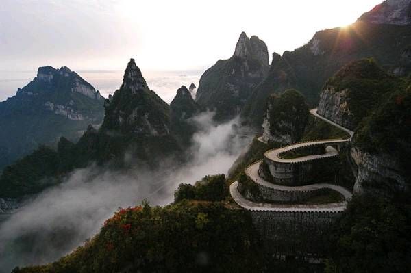 天門洞以其接地通天的態(tài)勢(shì),成為人們心中通天的門戶,而通往天門洞的盤山公路也因此被稱為“通天大道”。更為神奇的是,在公路竣工的時(shí)候,人們驚奇地發(fā)現(xiàn),這條順山勢(shì)修建的通天大道剛好99個(gè)彎,暗合了“天有九重,云有九霄”之意。 通天大道以進(jìn)山時(shí)的標(biāo)志門為起點(diǎn),一直通達(dá)天門洞腳下,全長(zhǎng) 10.77 千米,但就在這么短的距離里,它的海拔卻從 200 米 急劇提升到了 1300 米,大道兩側(cè)絕壁千仞,空谷幽深,180 度的急彎此消而彼,層層疊起,“ 堪稱天下第一公路奇觀 ”。中國書法協(xié)會(huì)常務(wù)副會(huì)長(zhǎng)沈鵬先生走過通天大道后欣然為其題字“曲道通天”,字體遒勁挺拔,與通天大道的奇絕天下相融為一體。通天大道于 1998 年開始修建,因天門山獨(dú)特的地質(zhì)和氣候所局限,至 2005年全面貫通,歷時(shí)8年,共耗資 1 億元人民幣。整個(gè)工程充滿著艱辛卓絕,它凝聚著全體施工人員的智慧和心血,其勢(shì)驚險(xiǎn)奇絕,蕩氣回腸,以蜿蜒迂回穿行于山體絕壁之天險(xiǎn)而成為天下第一公路奇觀。