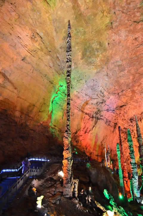 跨過中國游覽洞穴中跨度最大的石拱橋天仙橋,便進(jìn)入黃龍洞第三層天柱街了。天柱街是天上的街市,是神仙做生意的地方。天柱街以繁華似錦、春意盎然的“天上街市”為中心,西街花果山石柱石花重重疊疊,東街“天堂宮” 穹形洞頂高大幽深。順著長(zhǎng)長(zhǎng)的崩塌的斜坡往上看,兩根大石柱及壁流石被地下水溶蝕形成了奇妙的空洞,因從不同的地方可以敲出奇妙而悅耳的音符得名“石琴山”。一九八四年,中央電視臺(tái)拍攝電視專題片《地下明珠——黃龍洞》的時(shí)候,就是在這兩根石柱上敲擊出了一曲完整的《賣報(bào)歌》。